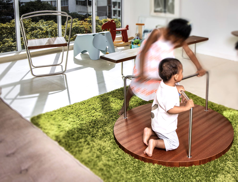 这款多用途玩乐家具为住在小公寓里的低龄儿童的父母设计,它既是家具又是玩乐设备。在直立状态下,它是简单低矮的咖啡桌,桌面可以旋转。颠倒过来,它就成了孩子们在家里的旋转木马。这款旋转木马圆桌由木材和钢制成,能经受住时间的考验。