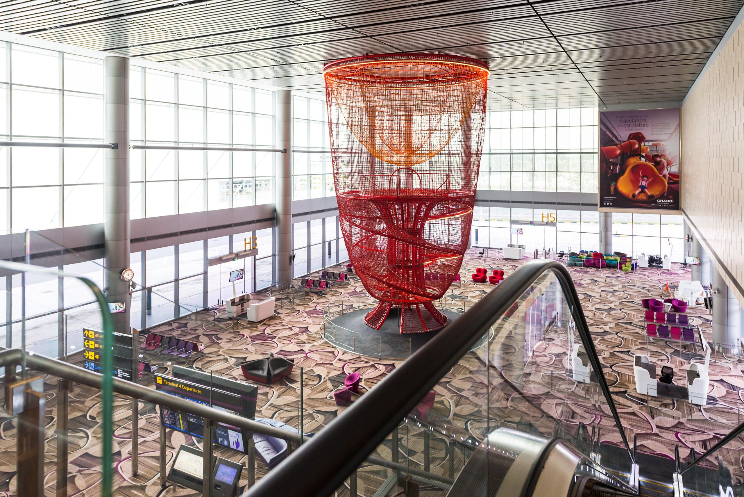 樟宜机场吊灯网游乐设施是新加坡最高的定制垂直网状游乐设施,位于樟宜机场4号航站楼中转区,重新定义了机场中转体验。这个五层楼高的结构由10千米长的绳索制成,并由15吨的钢材支撑。该游乐设施为6至12岁儿童设计,可供多达50名成人和儿童攀爬、跳跃和滑下。
