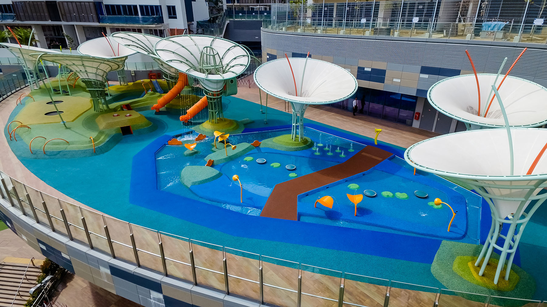 这是新加坡首个将灯光与干湿两用游乐场相结合的景点,打造出一个兼具趣味性与可玩性的雕塑群。大型百合状游戏树提供阴凉,露台则为孩子们提供柔软的玩耍表面,家长也可以将其用作座椅。孩子们可以在河流中添加障碍物,创造性地改变其水流。